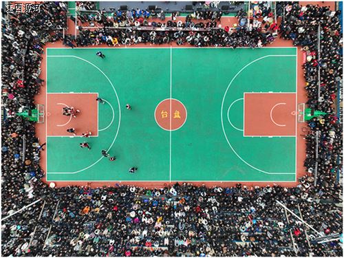 这是2023年3月27日在贵州省黔东南州台江县台盘村拍摄的贵州省首届“美丽乡村”篮球联赛总决赛比赛现场(无人机照片)。新华社记者 欧东衢 摄